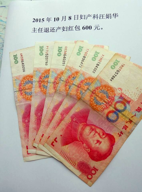 2015年10月8日,婦產科汪娟華主任查完病房,10床產婦汪俐華家屬塞給汪主任一個紅包,孕婦馬上要進產房分娩,為了讓家屬放心,將600元紅包暫時收下交護士長,到收費處替產婦汪俐華交辦了住院費用手續,汪主任看到母子平安,對他們說:治病是醫生本職,希望病人理解,安心養病早日出院,孕婦及家屬非常感動。